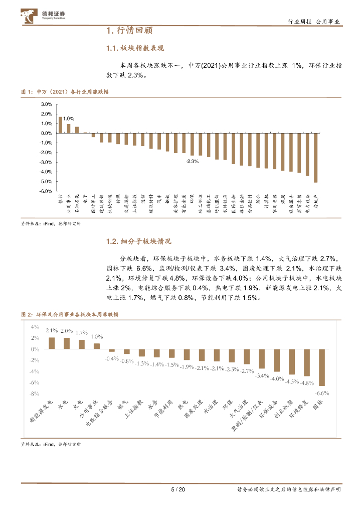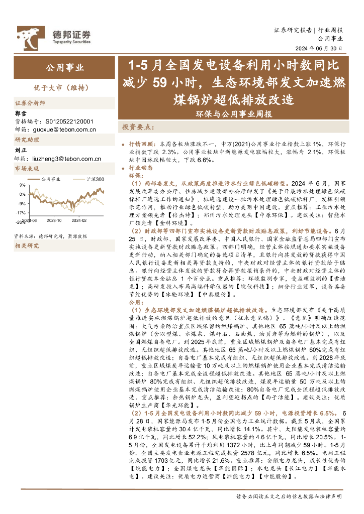 德邦证券:环保与公用事业行业周报:1-5月全国发电设备利用小时数同比减少59小时,生态环境部发文加速燃煤锅炉超低排放改造.pdf