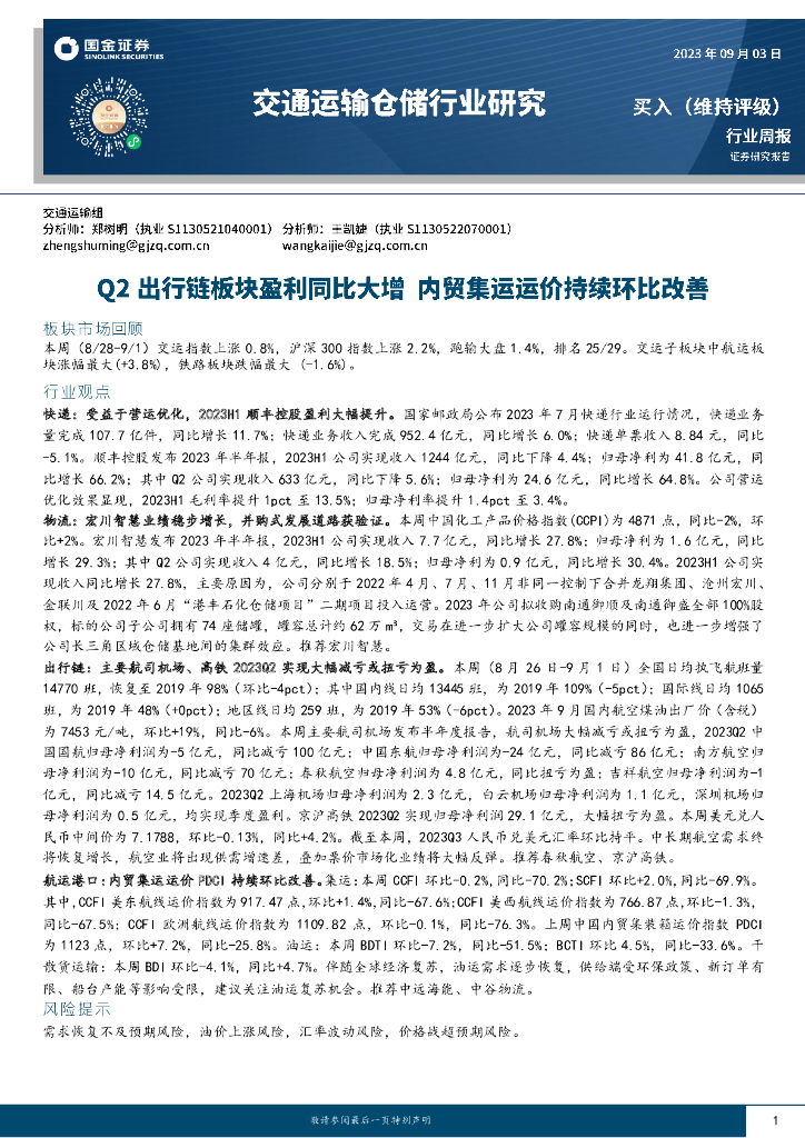 国金证券:交通运输仓储行业研究:Q2出行链板块盈利同比大增 内贸集运运价持续环比改善.pdf