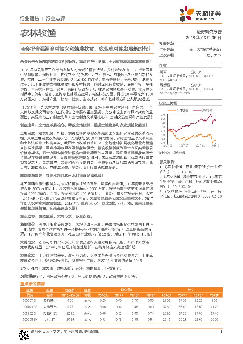天风证券:农林牧渔行业点评:两会报告强调乡村振兴和精准扶贫,农业农村迎发展新时代!.pdf