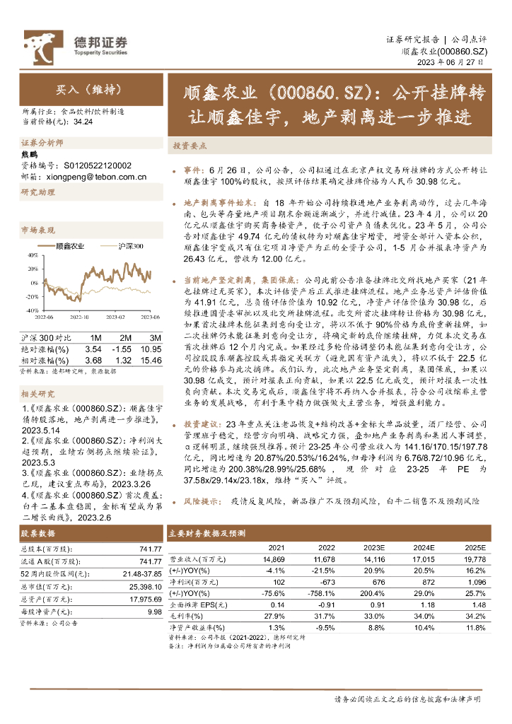 德邦证券:顺鑫农业(000860)-公开挂牌转让顺鑫佳宇,地产剥离进一步推进.pdf