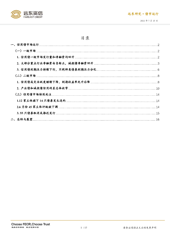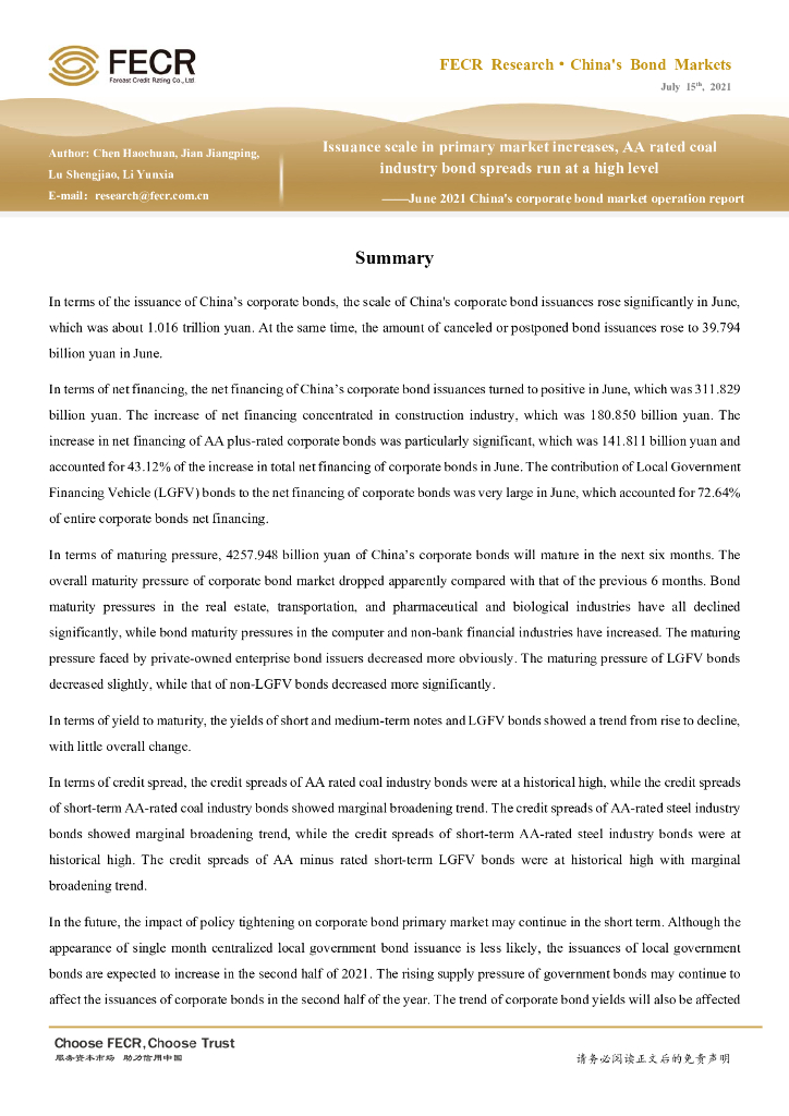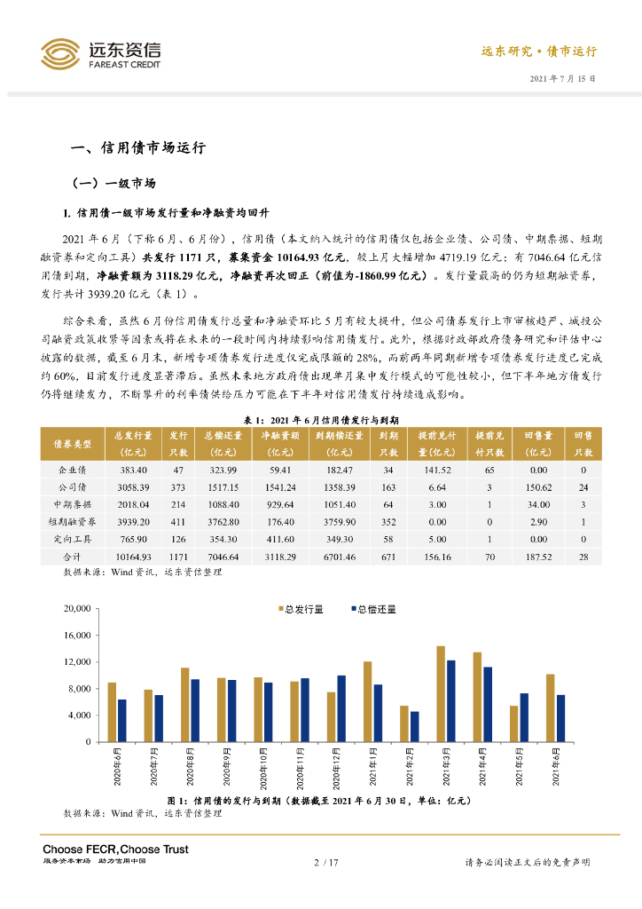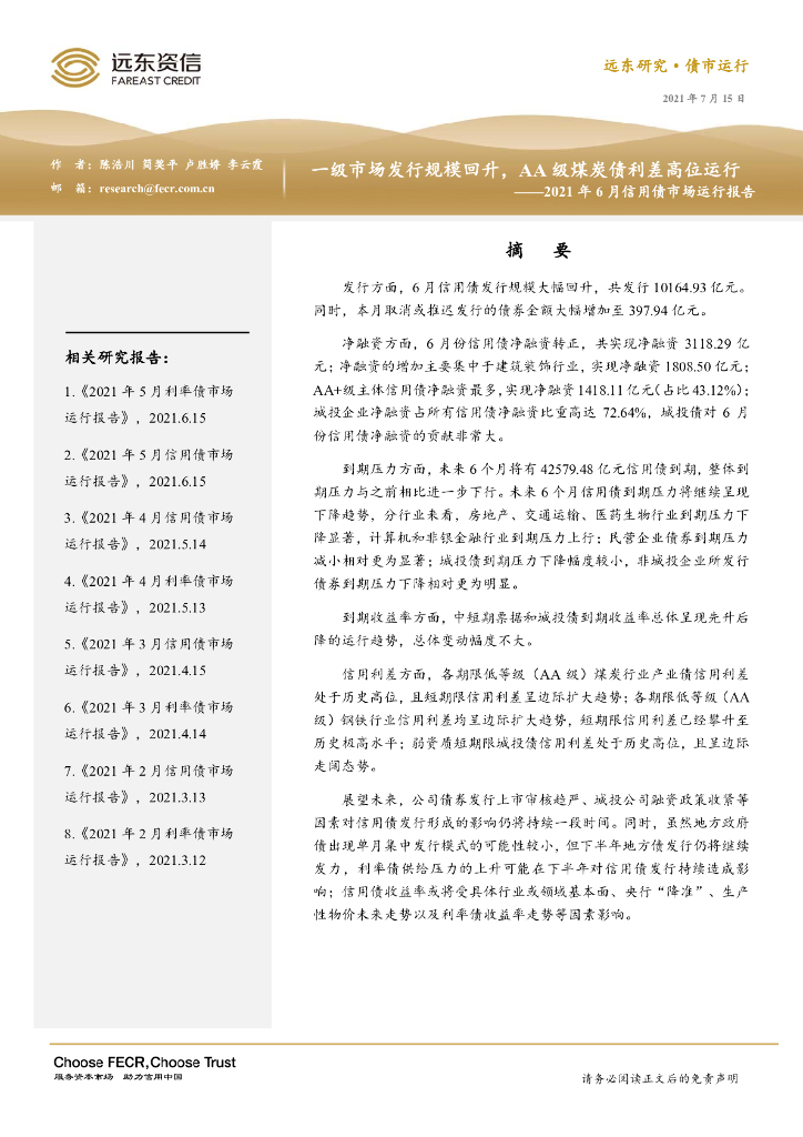 远东资信:2021年6月信用债市场运行报告:一级市场发行规模回升,AA级煤炭债利差高位运行.pdf