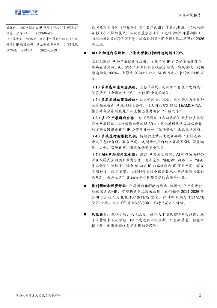 国海证券:上海电影(601595)-2024H1业绩点评:业绩韧性较强,IP业务业绩翻倍增长.pdf