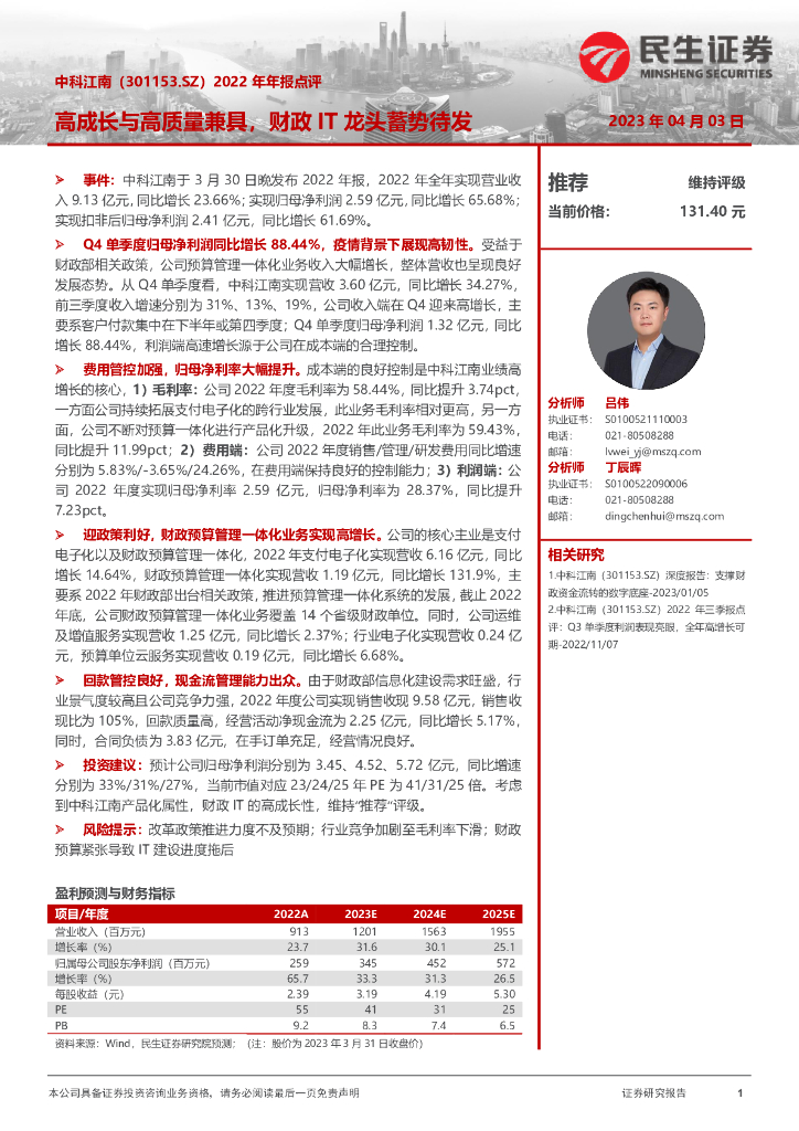 民生证券:中科江南(301153)-2022年年报点评:高成长与高质量兼具,财政IT龙头蓄势待发.pdf