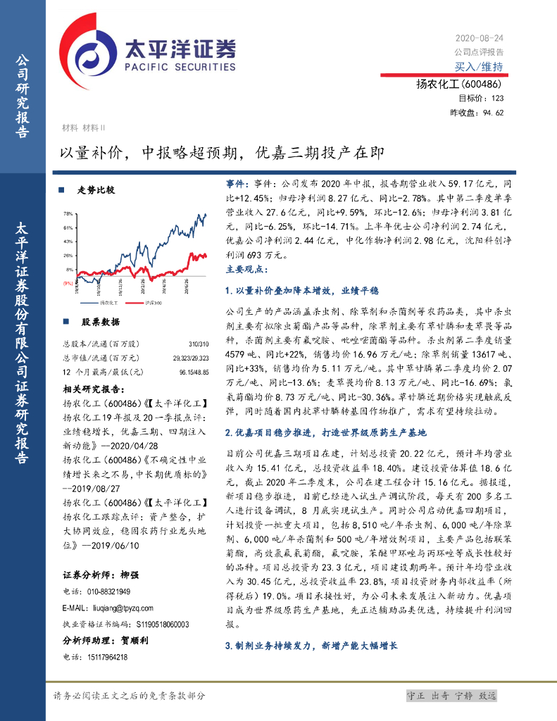 太平洋证券:扬农化工(600486)-以量补价,中报略超预期,优嘉三期投产在即.pdf