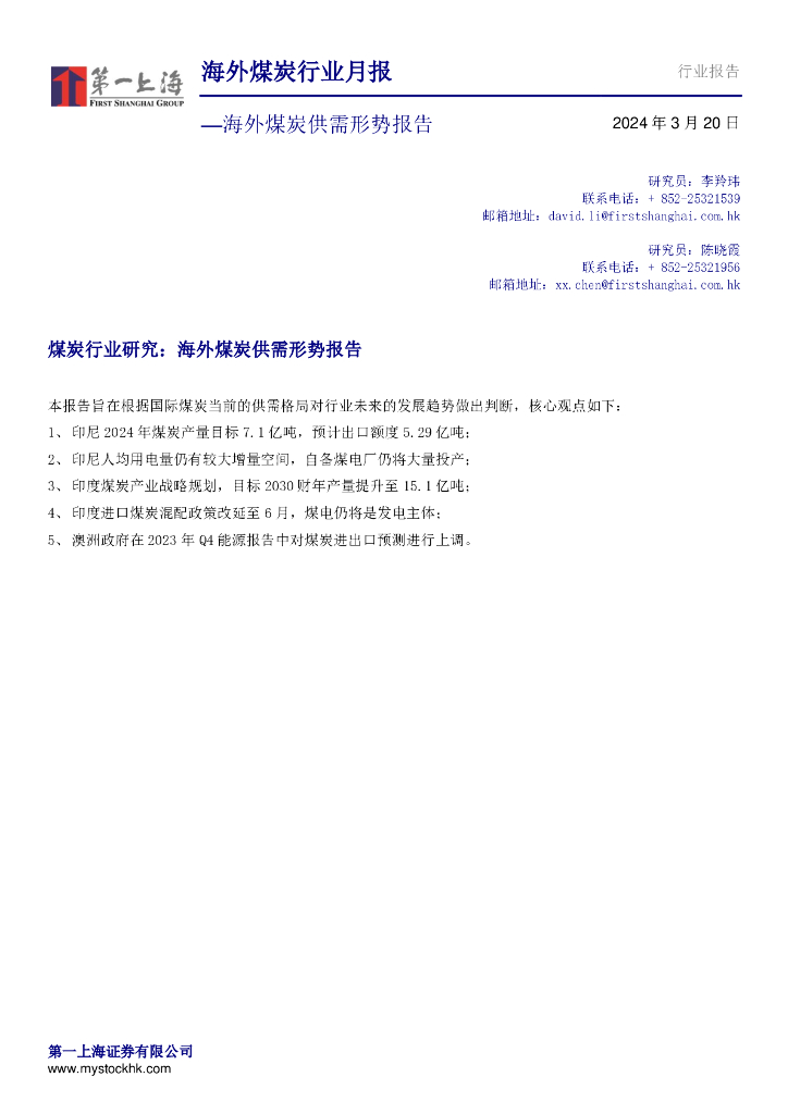 第一上海证券:海外煤炭行业月报:海外煤炭供需形势报告.pdf