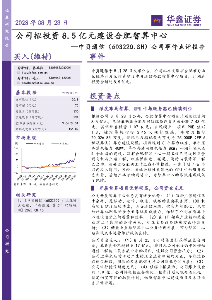 华鑫证券:中贝通信(603220)-公司事件点评报告:公司拟投资8.5亿元建设合肥智算中心.pdf
