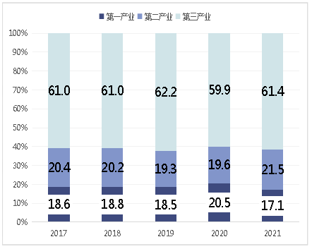 图2 2017-2021年全市三次产业增加值占 地区生产总值比重(%)