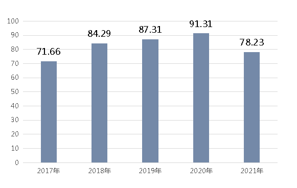 图5 2017-2021年全市粮食产量(万吨)