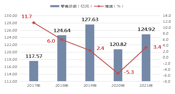 图6 2017-2021年社会消费品零售总额和增速