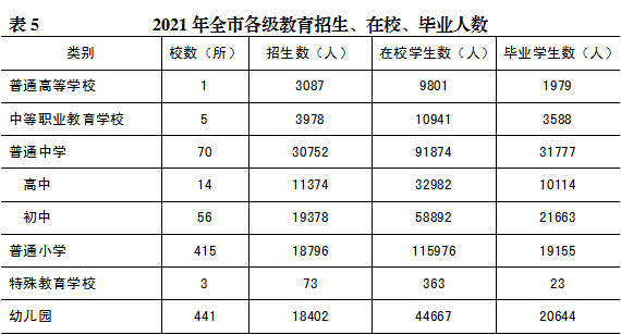 年末全市各级各类学校935所,教职工22018人。全年全市学前教育毛入园率87.6%,小学学龄人口入学率100%,初中生毛入学率117.88%,小学六年巩固率99.89%,初中三年巩固率为98.3%,九年义务教育完成率89.36%。