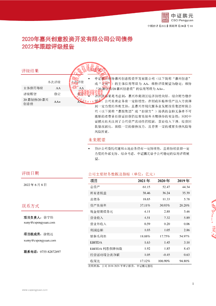 鹏元:2020年嘉兴创意投资开发有限公司公司债券2022年跟踪评级报告.pdf