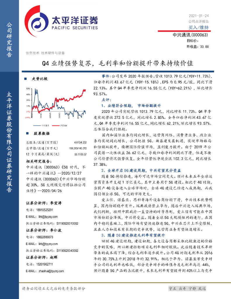 太平洋证券:中兴通讯(000063)-Q4业绩强势复苏,毛利率和份额提升带来持续价值.pdf