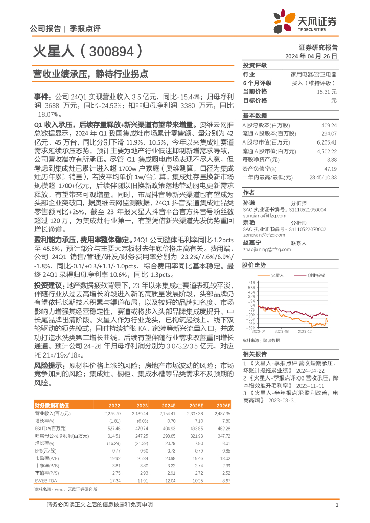 天风证券:火星人(300894)-营收业绩承压,静待行业拐点.pdf