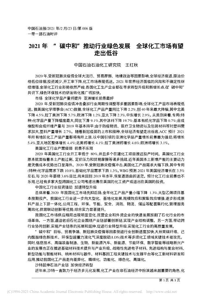 王红秋:2021年“碳中和”推动行业绿色发展,全球化工市场有望走出低谷.pdf