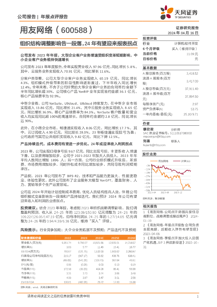 天风证券:用友网络(600588)-组织结构调整影响告一段落,24年有望迎来报表拐点.pdf