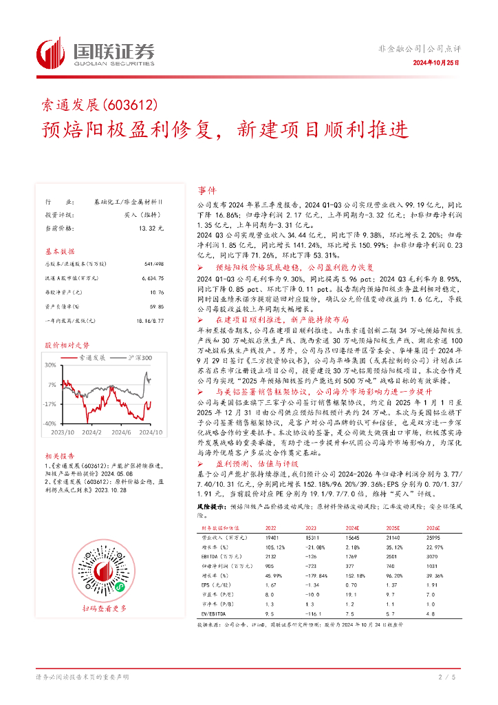 国联证券:索通发展(603612)-预焙阳极盈利修复,新建项目顺利推进.pdf