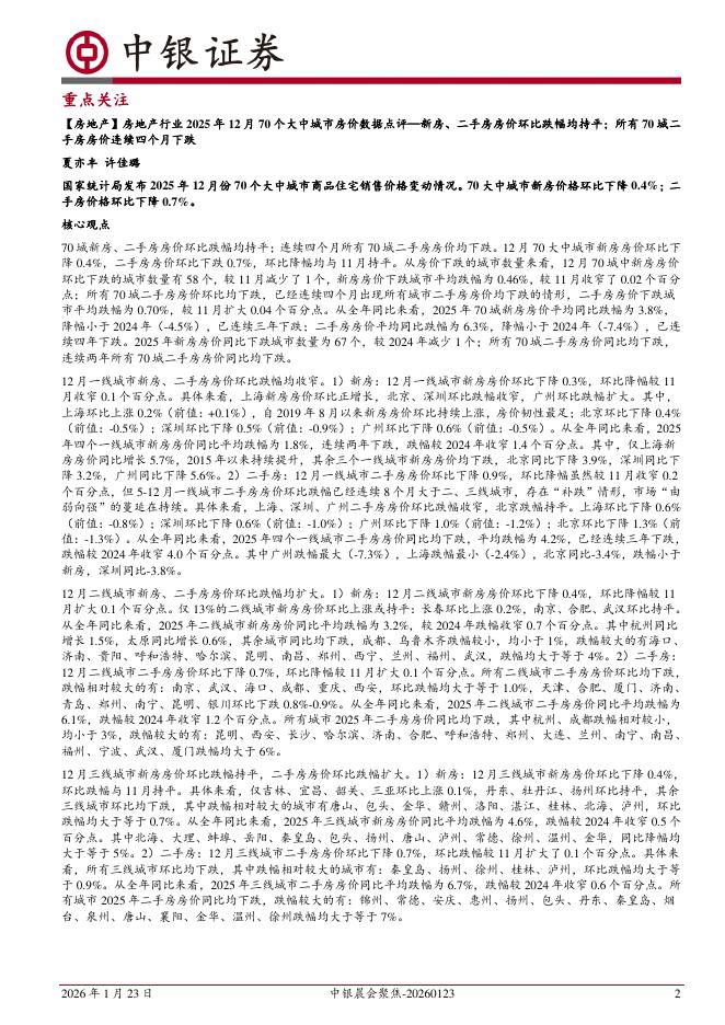 中银证券:房地产行业2026年1月70个大中城市房价数据点评:70城新房房价环比跌幅持平,二手房房价环比跌幅收窄;一线城市二手房房价环比跌幅收窄幅度最大