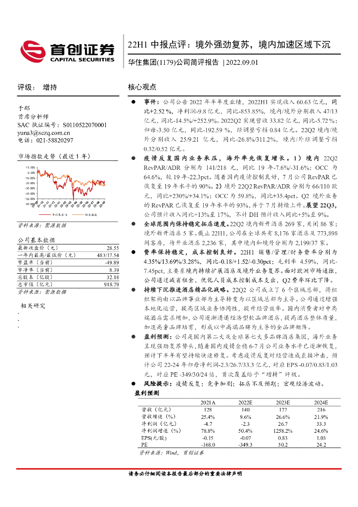 首创证券:华住集团-S(01179)港股公司研究报告-公司简评报告:22H1中报点评:境外强劲复苏,境内加速区域下沉.pdf