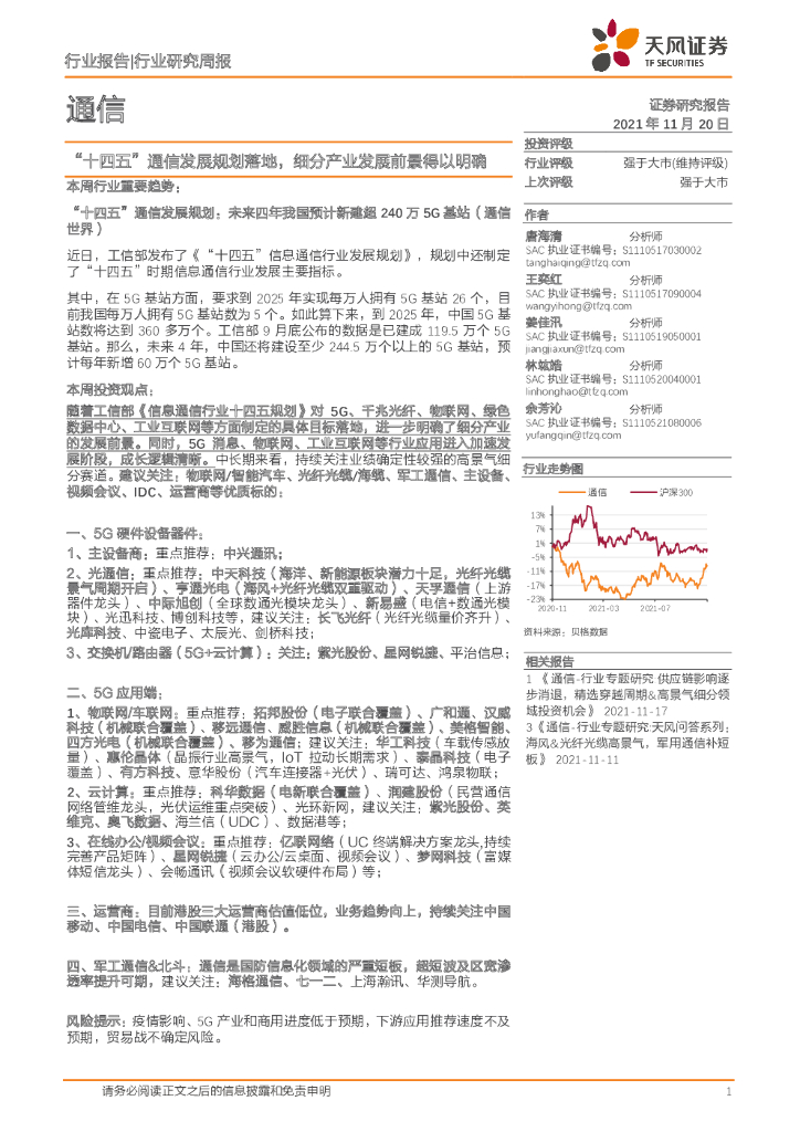 天风证券:通信:“十四五”通信发展规划落地,细分产业发展前景得以明确.pdf