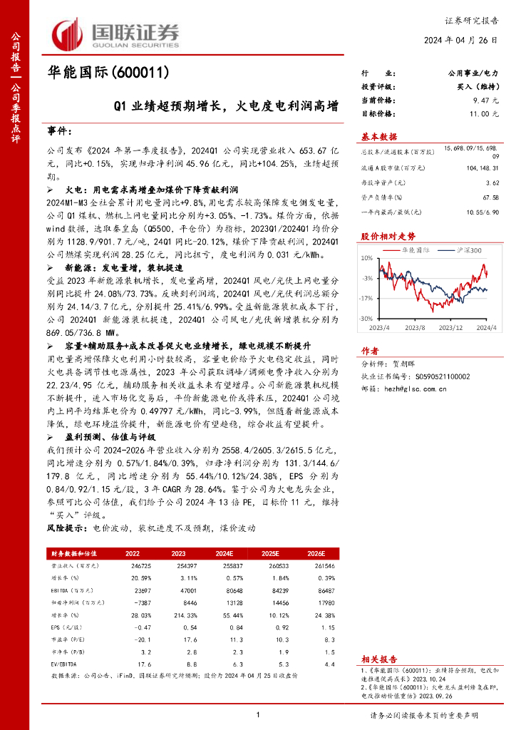 国联证券:华能国际(600011)-Q1业绩超预期增长,火电度电利润高增.pdf