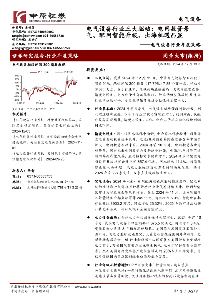 中原证券:电气设备行业年度策略:电气设备行业三大驱动,电网投资景气、配网智能升级、出海机遇凸显.pdf