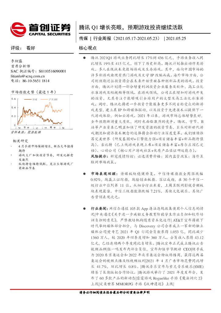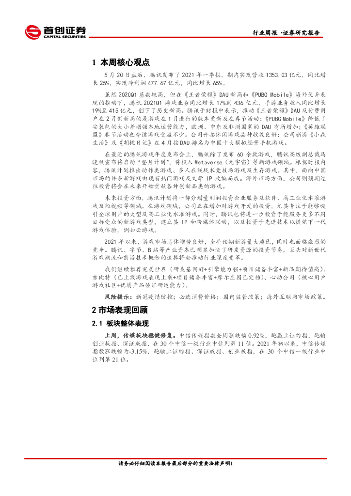 首创证券:传媒行业周报:腾讯Q1增长亮眼,预期游戏投资继续活跃.pdf