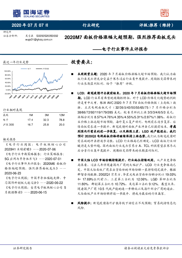 国海证券:电子行业事件点评报告:2020M7面板价格涨幅大超预期,强烈推荐面板龙头.pdf