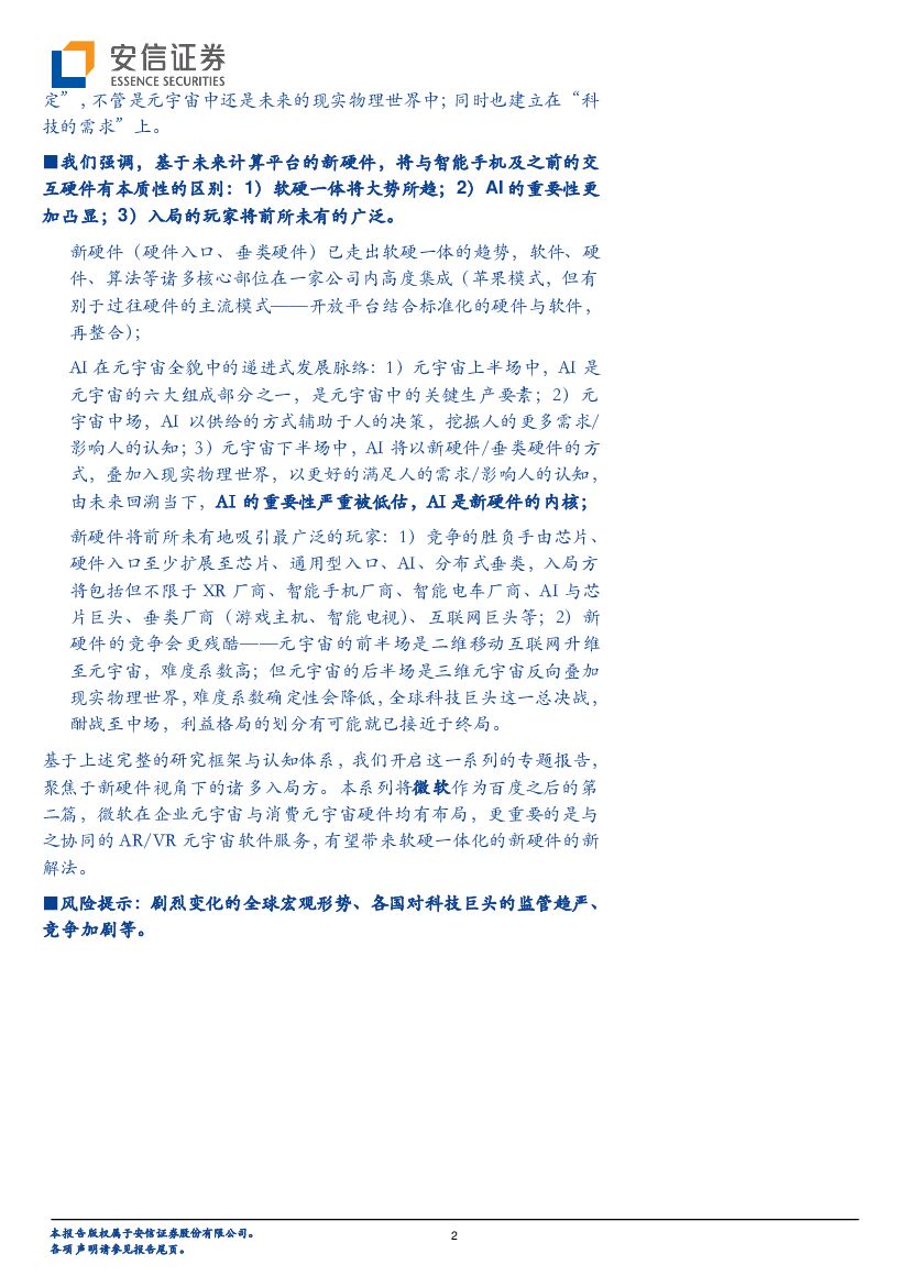安信证券:传媒:科技巨头布局新硬件系列报告2:微软,有新硬件但仍侧重软件主导,关注其配套新硬件的元宇宙软件服务.pdf