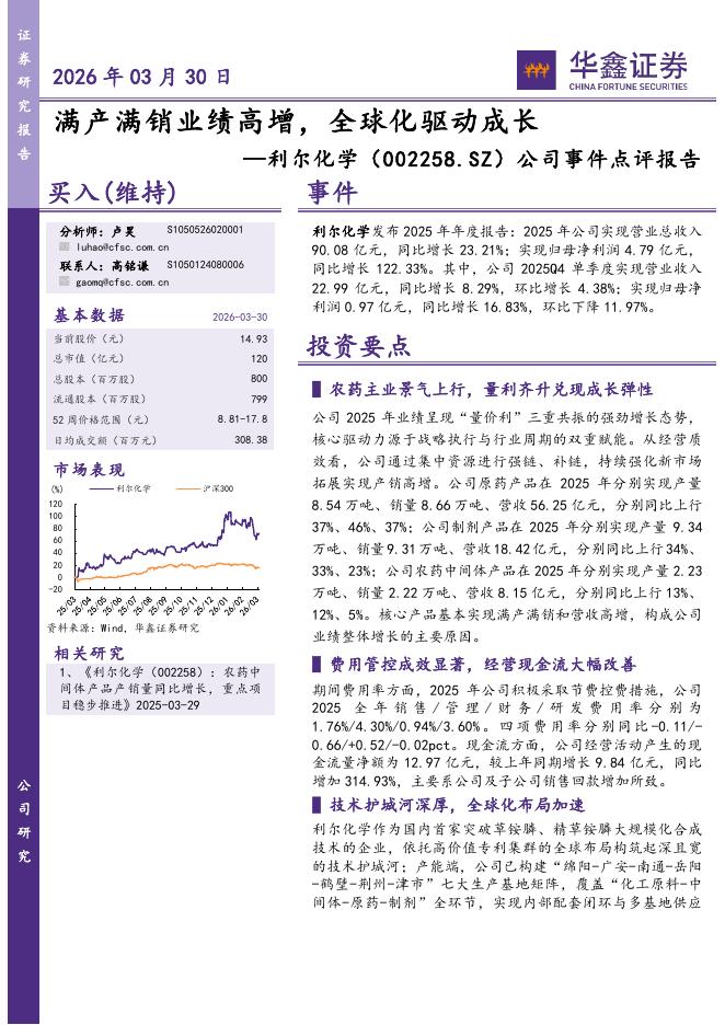 华鑫证券:利尔化学(002258)-公司事件点评报告:满产满销业绩高增,全球化驱动成长.pdf