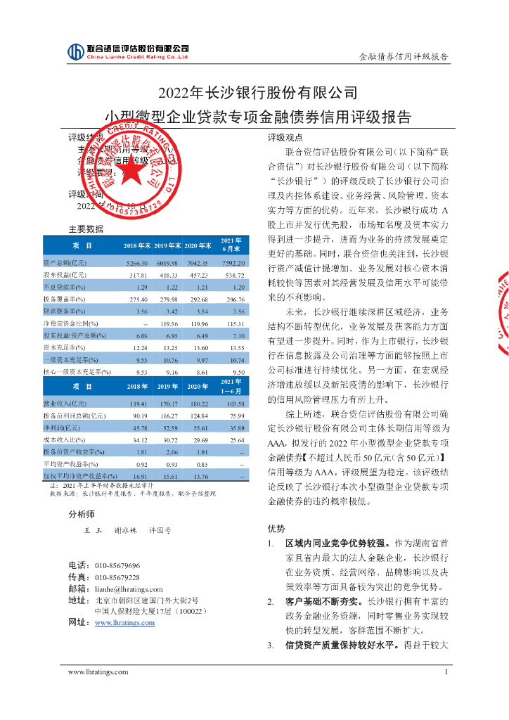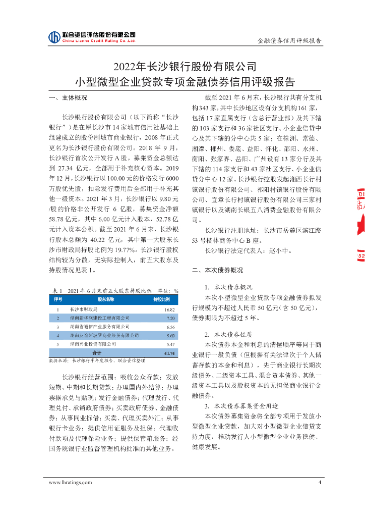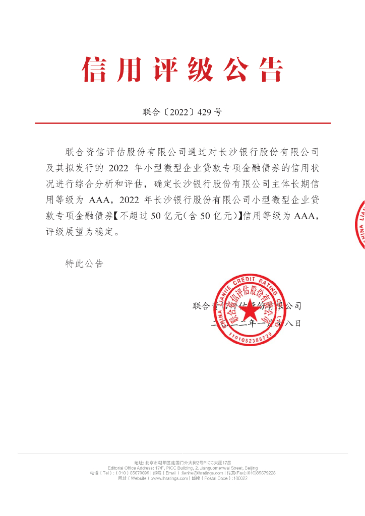 联合资信:2022年长沙银行股份有限公司小型微型企业贷款专项金融债券信用评级报告及跟踪评级安排.pdf