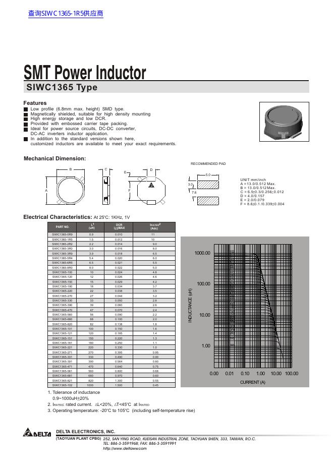 DELTA S IWC1365 Type SMT Power Inductor 数据手册.pdf