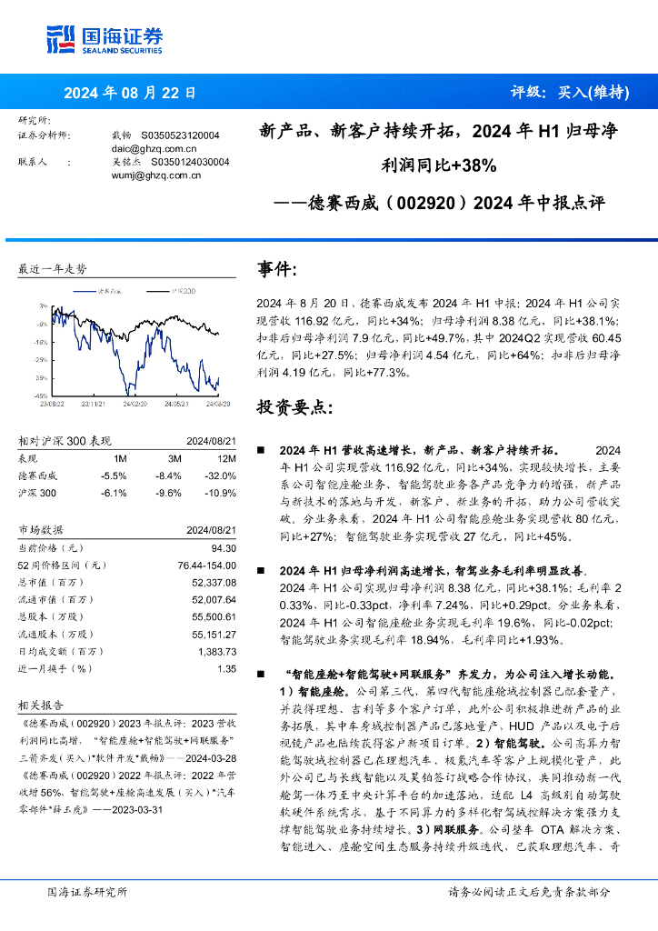 国海证券:德赛西威(002920)-2024年中报点评:评级:买入(维持)新产品、新客户持续开拓,2024年H1归母净利润同比+38%.pdf