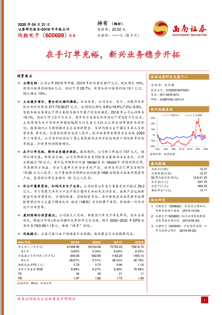 西南证券:均胜电子(600699)-2019年年报点评:在手订单充裕,新兴业务稳步开拓.pdf