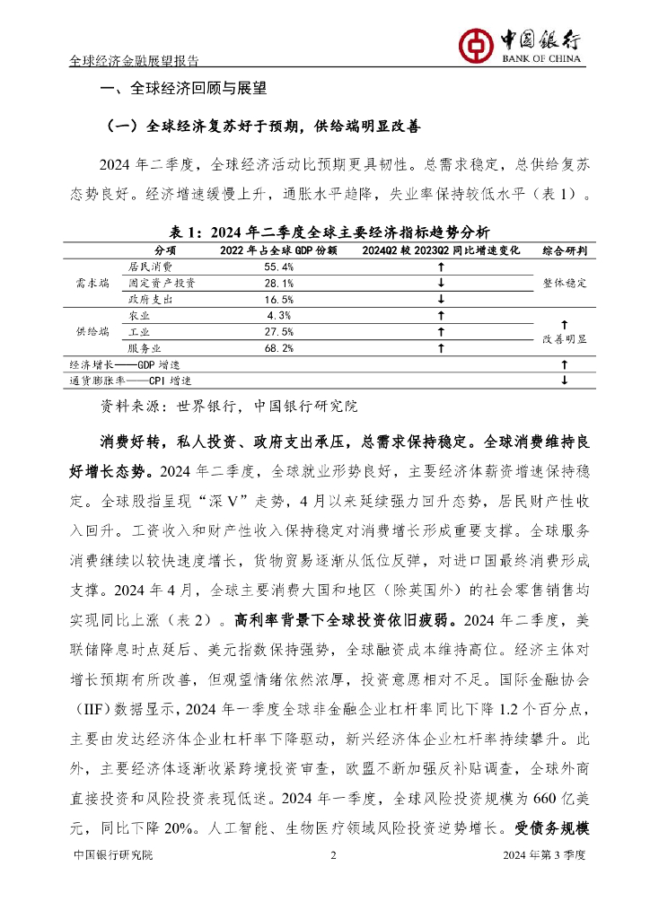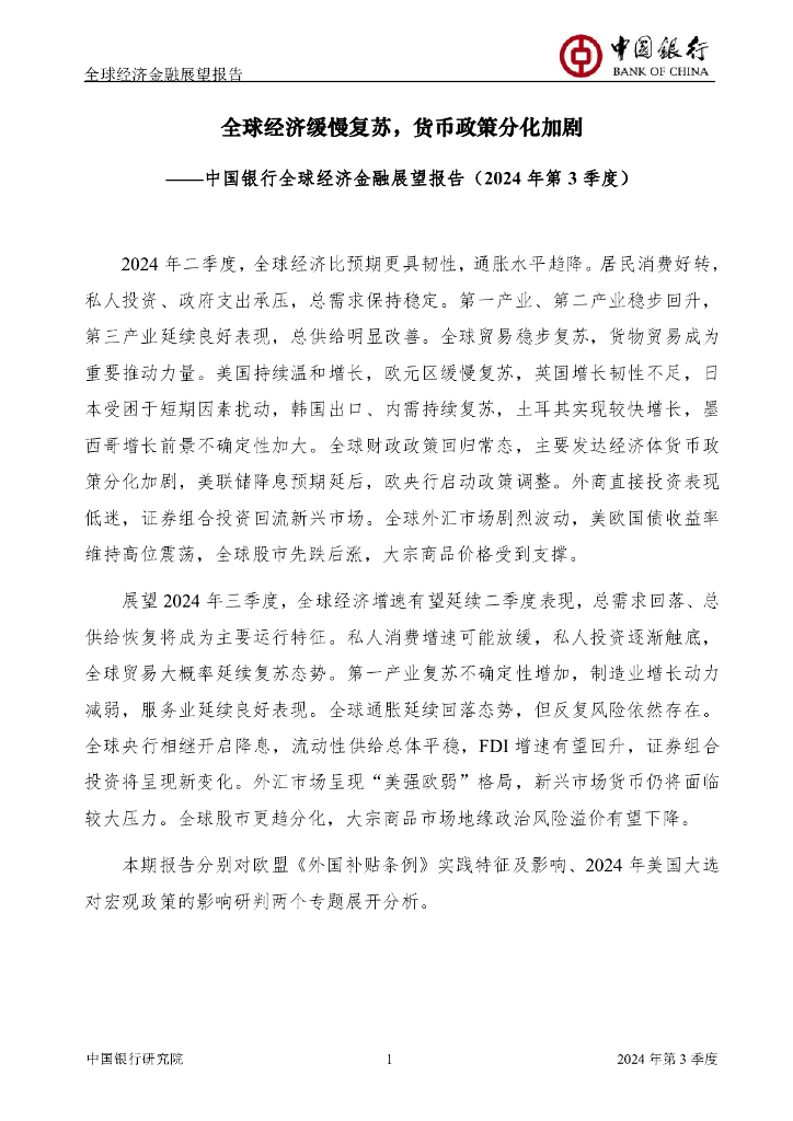 中国银行研究院:中国银行全球经济金融展望报告(2024年第3季度):全球经济缓慢复苏,货币政策分化加剧.pdf