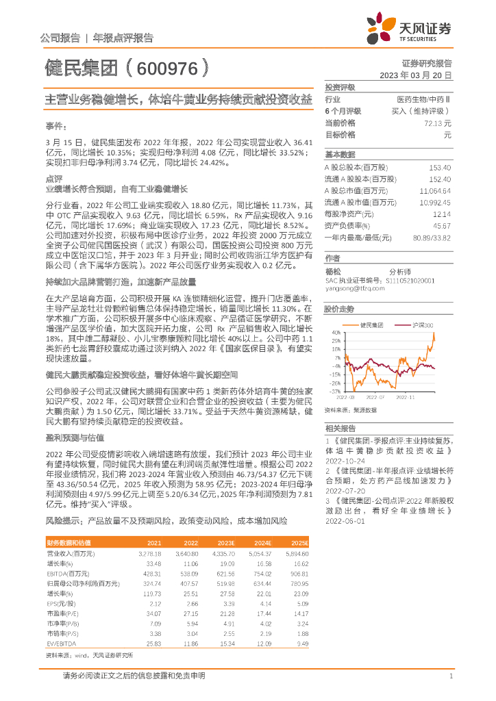 天风证券:健民集团(600976)-主营业务稳健增长,体培牛黄业务持续贡献投资收益.pdf