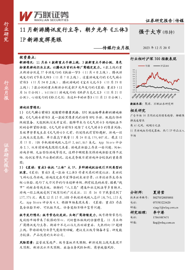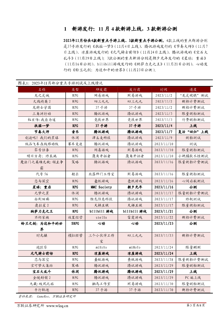 万联证券:传媒行业月报:11月新游腾讯发行主导,朝夕光年《三体》IP新游发挥亮眼.pdf