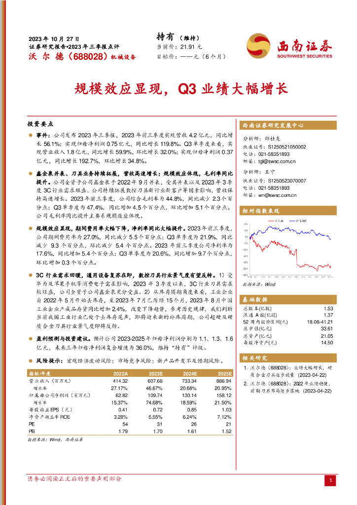 西南证券:沃尔德(688028)-2023年三季报点评:规模效应显现,Q3业绩大幅增长.pdf