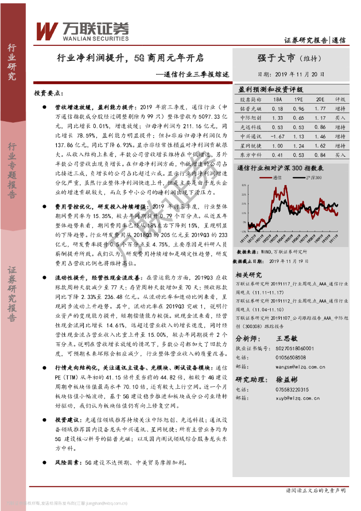 万联证券:通信行业三季报综述:行业净利润提升,5G商用元年开启.pdf