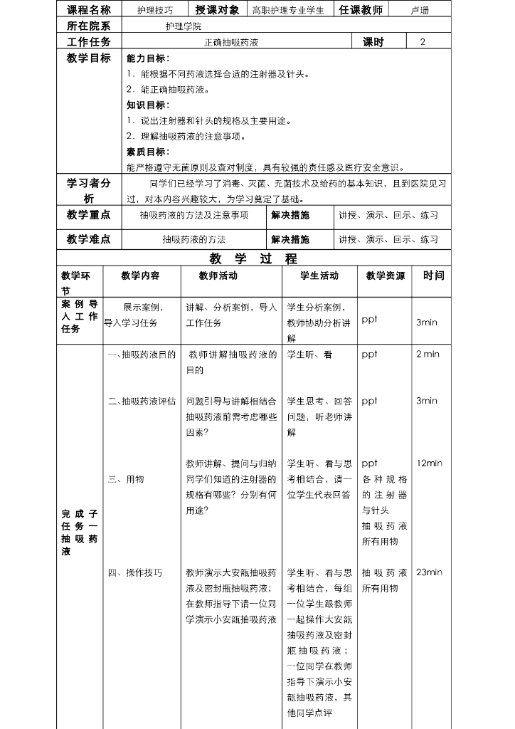《护理技巧》电子教案-子任务一 抽吸药液法.pdf