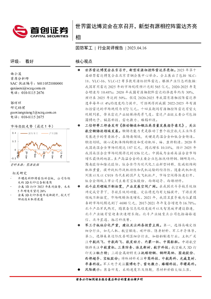 首创证券:国防军工行业简评报告:世界雷达博览会在京召开,新型有源相控阵雷达齐亮相.pdf