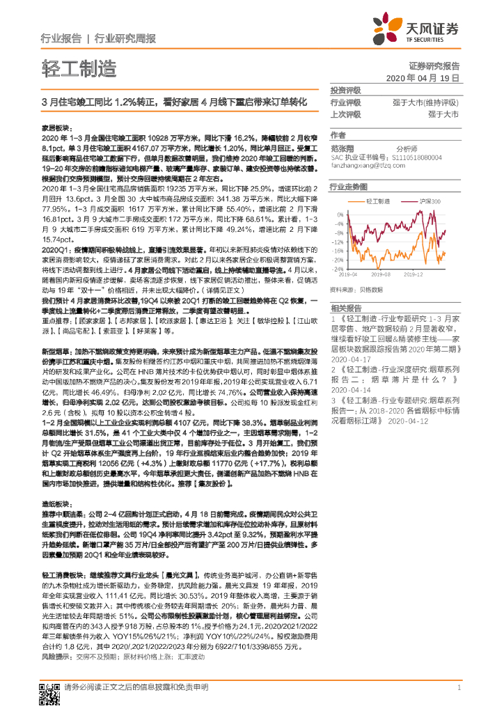 天风证券:轻工制造行业研究周报:3月住宅竣工同比1.2%转正,看好家居4月线下重启带来订单转化.pdf