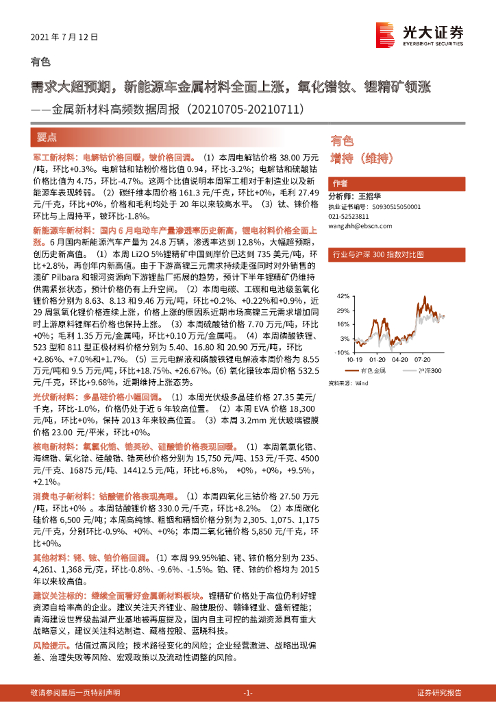 光大证券:金属新材料高频数据周报:需求大超预期,新能源车金属材料全面上涨,氧化镨钕、锂精矿领涨.pdf