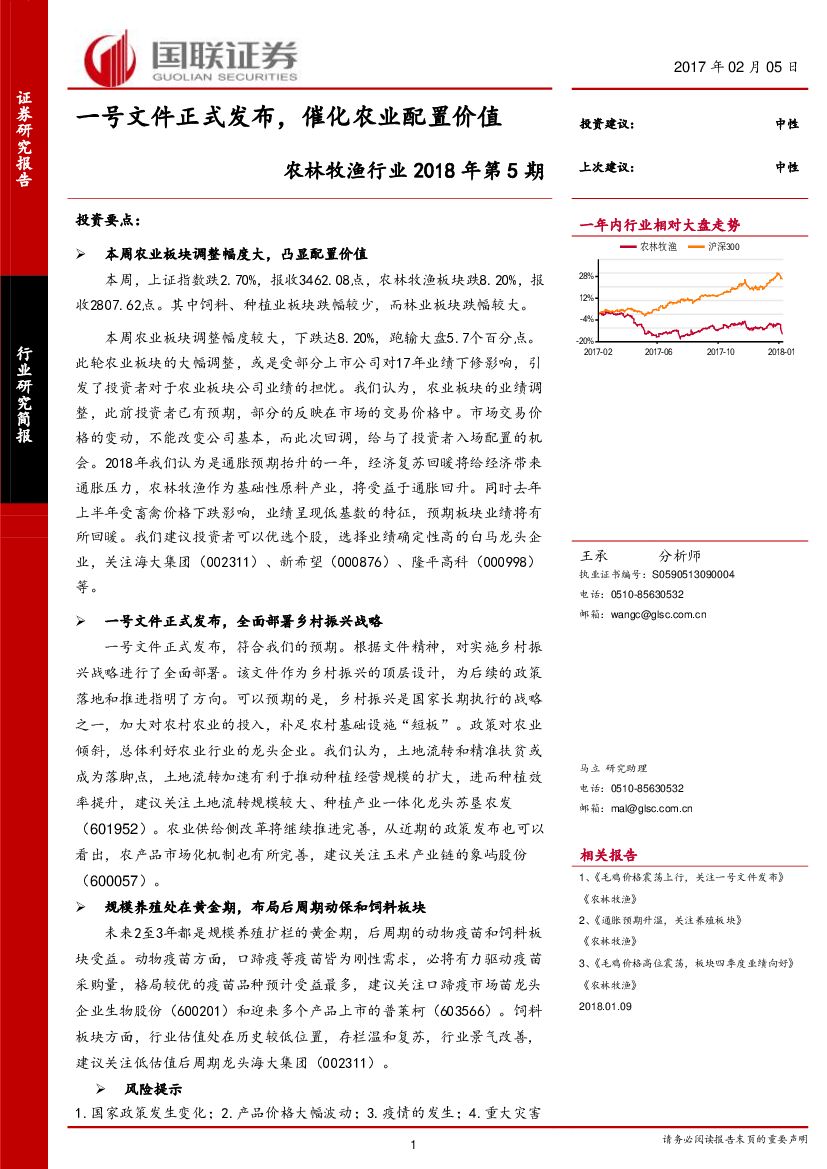国联证券:农林牧渔行业2018年第5期:一号文件正式发布,催化农业配置价值.pdf