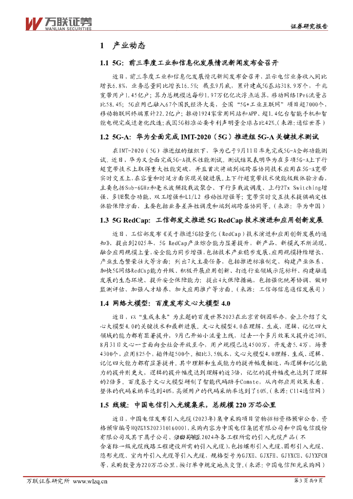 万联证券:通信行业周观点:华为完成5G-A关键技术测试,工信部发文推进5G RedCap发展.pdf