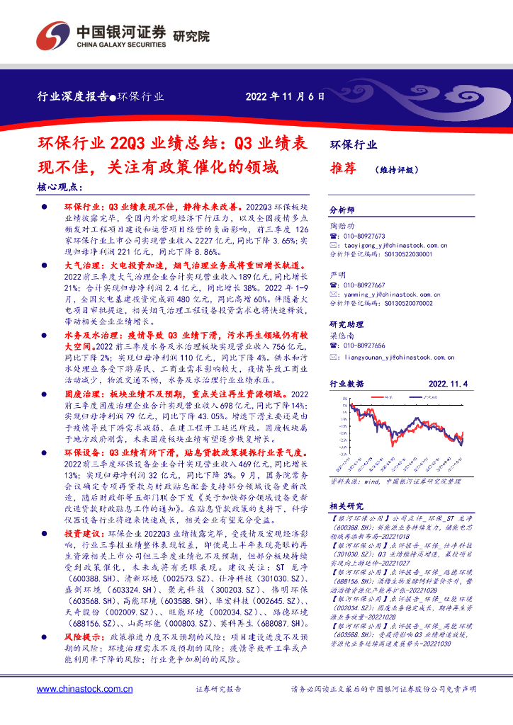 中国银河:环保行业22Q3业绩总结:Q3业绩表现不佳,关注有政策催化的领域.pdf