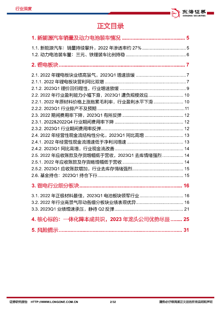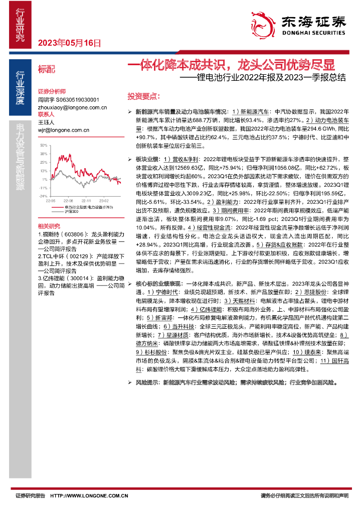 东海证券:锂电池行业2022年报及2023一季报总结:一体化降本成共识,龙头公司优势尽显.pdf