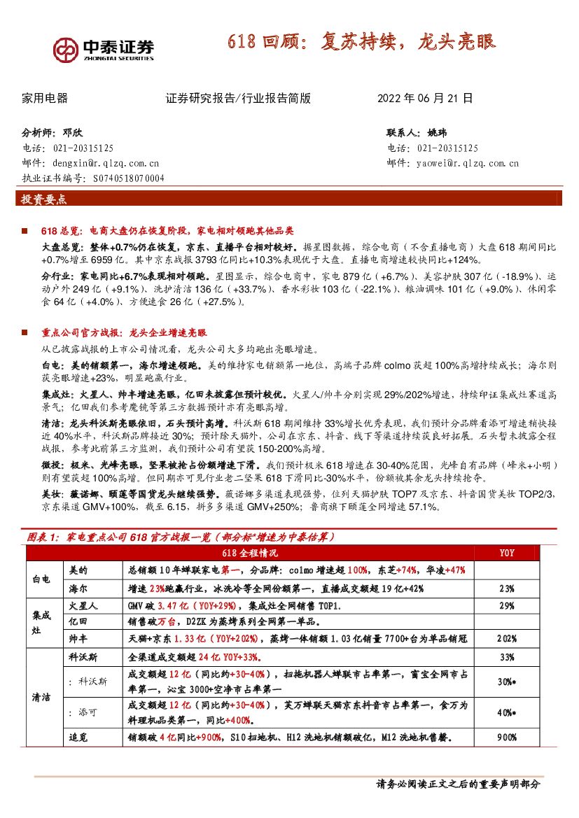 中泰证券:家用电器行业报告简版:618回顾:复苏持续,龙头亮眼.pdf