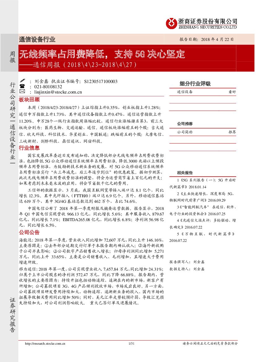 浙商证券:通信周报:无线频率占用费降低,支持5G决心坚定.pdf