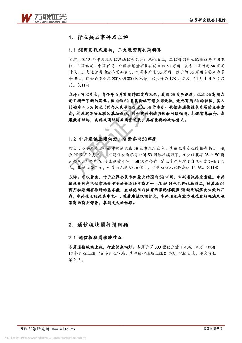 万联证券:通信行业周观点:5G商用仪式启动,中兴业绩持续向好.pdf