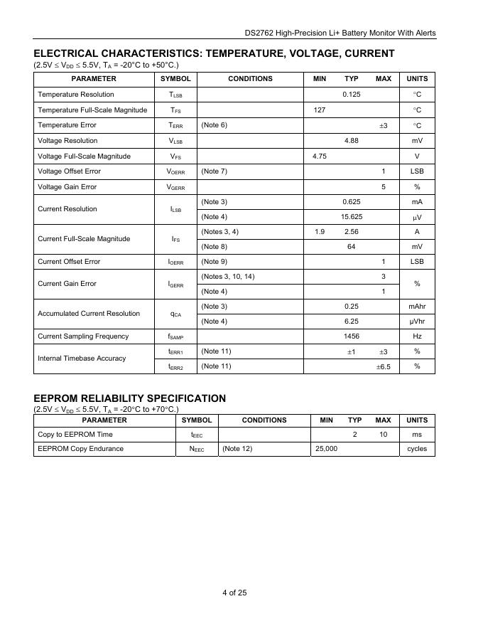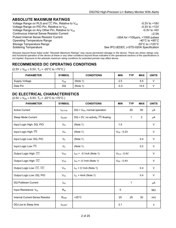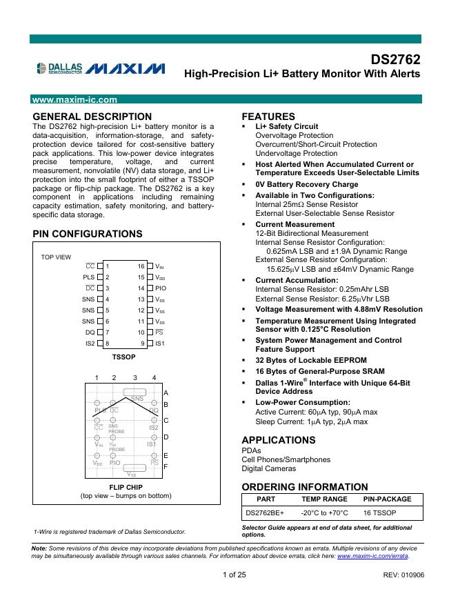 MAXIM DS2762 High-Precision Li+ Battery Monitor With Alerts 数据手册.pdf
